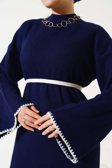 Yırtmaçlı Fitilli Triko Midi Elbise Zümrüt
