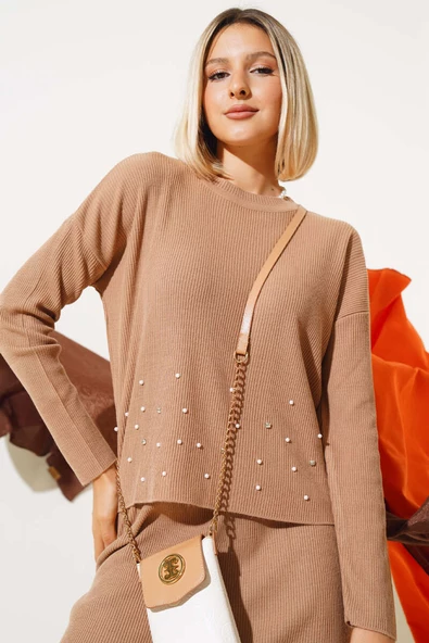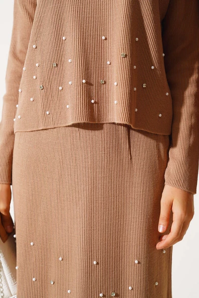 İnci Süslemeli Etekli Triko İkili Takım Büsküvi