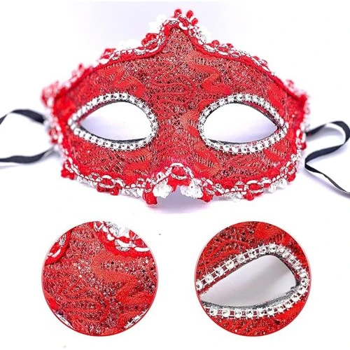 Periboia Kırmızı Renk Gözler Kristal Taşlı Dantelli Parti Maskesi