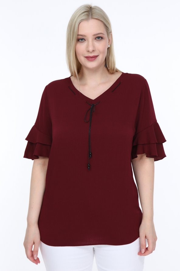 Lir Kadın Büyük Beden Volanlı kol Bluz Bordo L2319