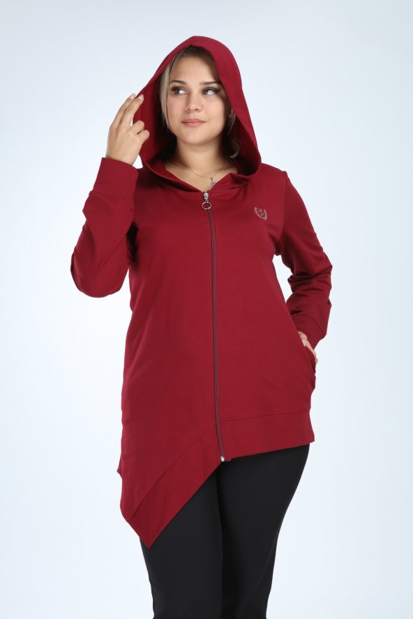 Pianoluce Kadın Büyük Beden Önü Fermuarlı Kapsonlu Cep Fermuarlı Ceket Bordo P5106