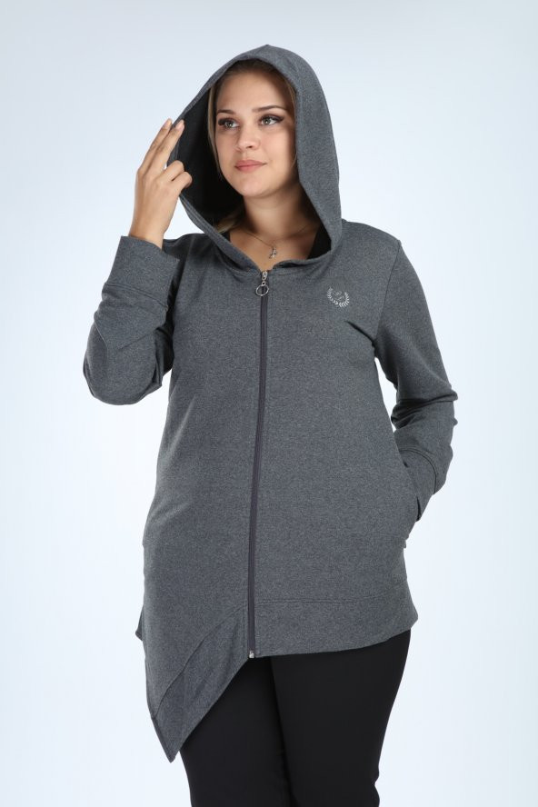 Pianoluce Kadın Büyük Beden Önü Fermuarlı Kapsonlu Cep Fermuarlı Ceket Antrasit P5106