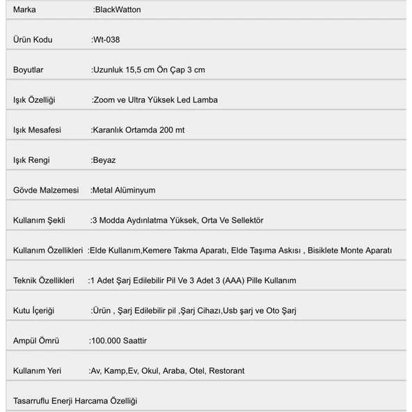 Watton Wt-038 - Zoomlu Şarjlı El Feneri