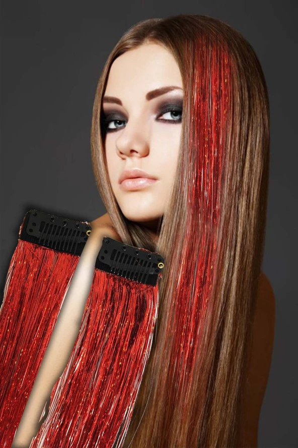 Prodiva Saç Aksesuarı Klipsli Simli Saç İpi - Kırmızı- 10 Paket/ 20 Adet