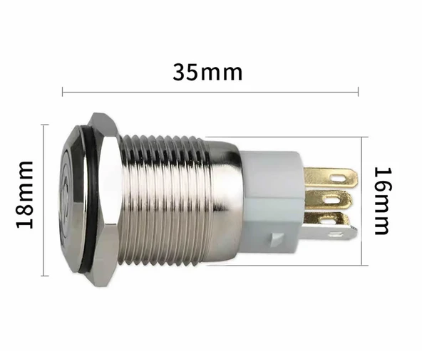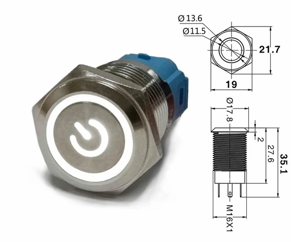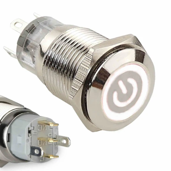 16mm Metal Latch Power Beyaz Led BT1608 16mm Metal Buton Beyaz Power Sembol Led Işıklı Panel Montaj Düz Kafa Kilitlemeli