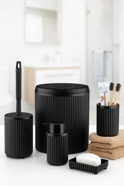 Lines Serisi Siyah Banyo Seti, 5 Parça Lüks Akrilik Çöp Kovası, Fırça, Sabunluk Banyo Aksesuar Seti