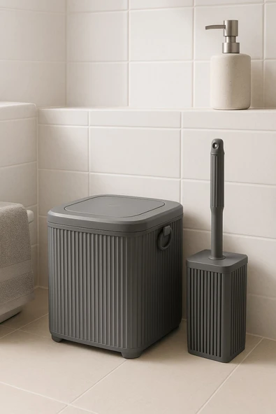 Lines Serisi Gri 2'li Banyo Seti, Akrilik Kare 5 Litre Çöp Kovası, Tuvalet Fırçası Takımı 3460