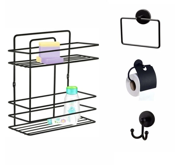 SAS Banyo Aksesuar Seti 4 Lü SİYAH , Ömür Boyu Paslanmaz Düz Şampuanlık Rafı SİYAH TŞ-02