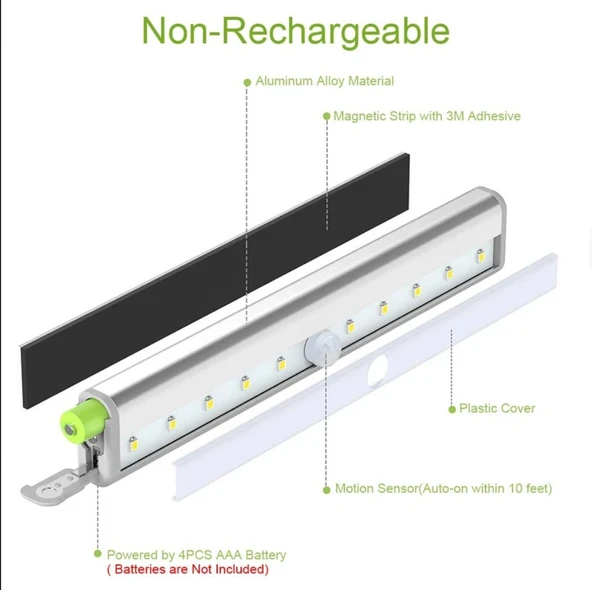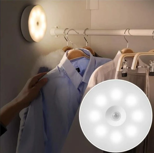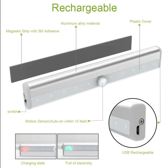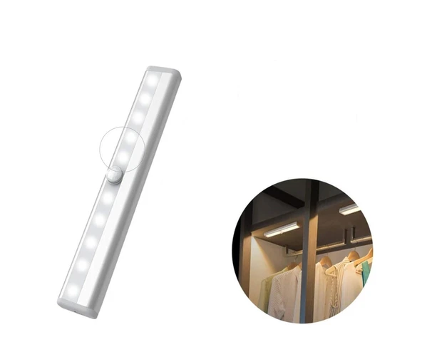 10 LED BEYAZ HAREKET SENSÖRLÜ ŞARJLI ELBİSE DOLABI ÇALIŞMA MASASI EV LED LAMBA IŞIK