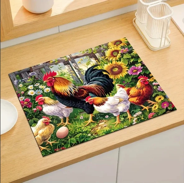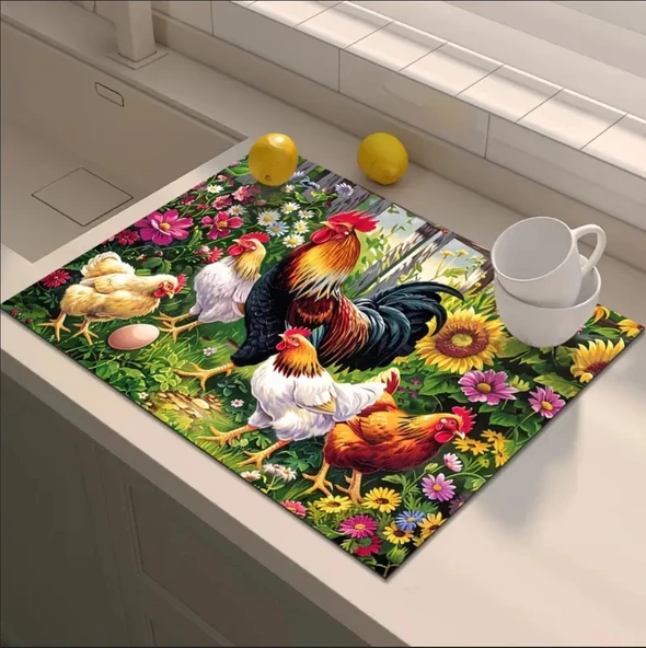 55 CM x 45 CM HOROZ VE TAVUK TASARIMI TEZGAH ÜSTÜ BULAŞIK KURUTMA MATI BULAŞIKLIK KURUTMA ÖRTÜSÜ