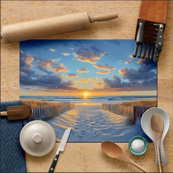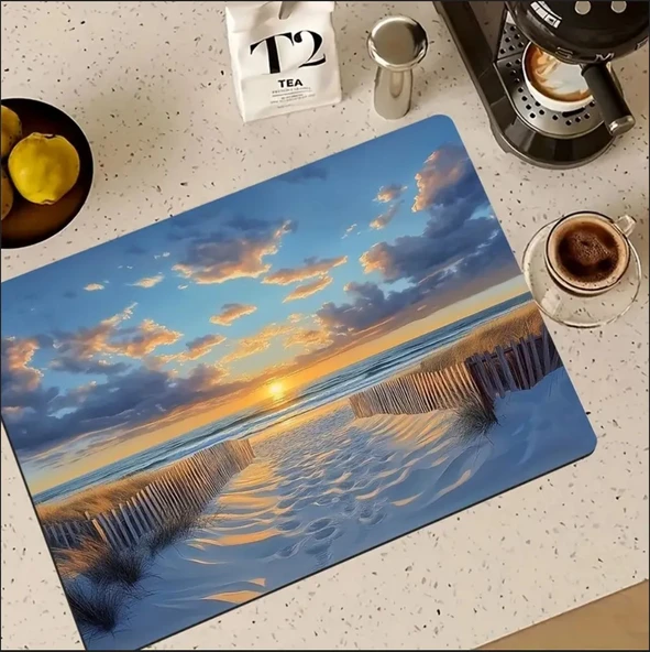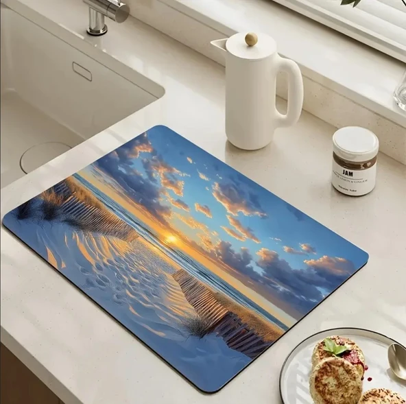 55 CM x 45 CM OKYANUS PLAJI TEMALI TEZGAH ÜSTÜ BULAŞIK KURUTMA MATI BULAŞIKLIK KURUTMA ÖRTÜSÜ
