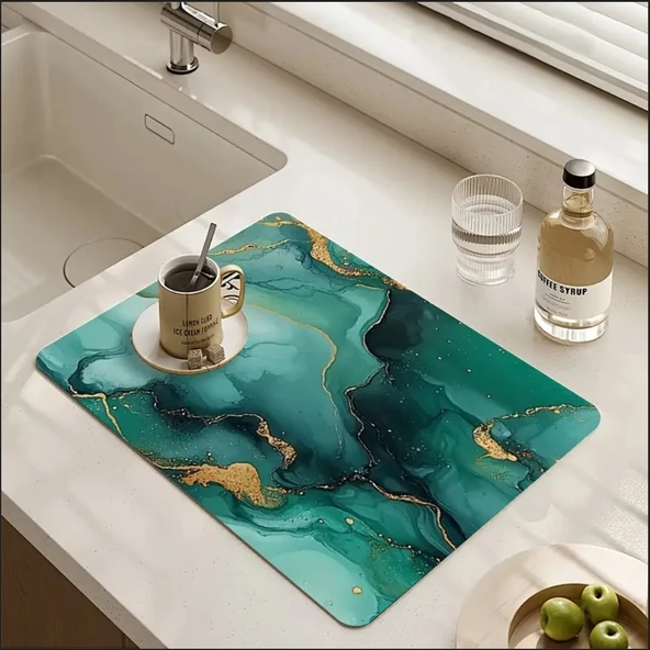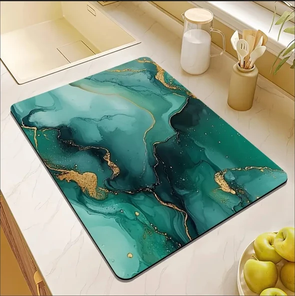 55 CM x 45 CM YEŞİL MERMER DESENLİ TEZGAH ÜSTÜ BULAŞIK KURUTMA MATI BULAŞIKLIK KURUTMA ÖRTÜSÜ