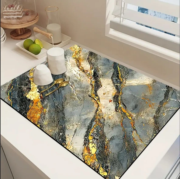 55 CM x 45 CM GRİ ALTIN MERMER TASARIMI TEZGAH ÜSTÜ BULAŞIK KURUTMA MATI BULAŞIKLIK KURUTMA ÖRTÜSÜ