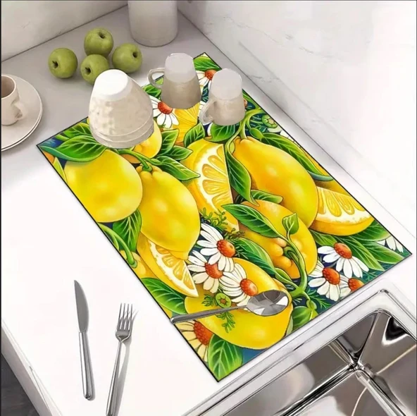 55 CM x 45 CM LİMON ÇİÇEĞİ TASARIMI TEZGAH ÜSTÜ BULAŞIK KURUTMA MATI BULAŞIKLIK KURUTMA ÖRTÜSÜ