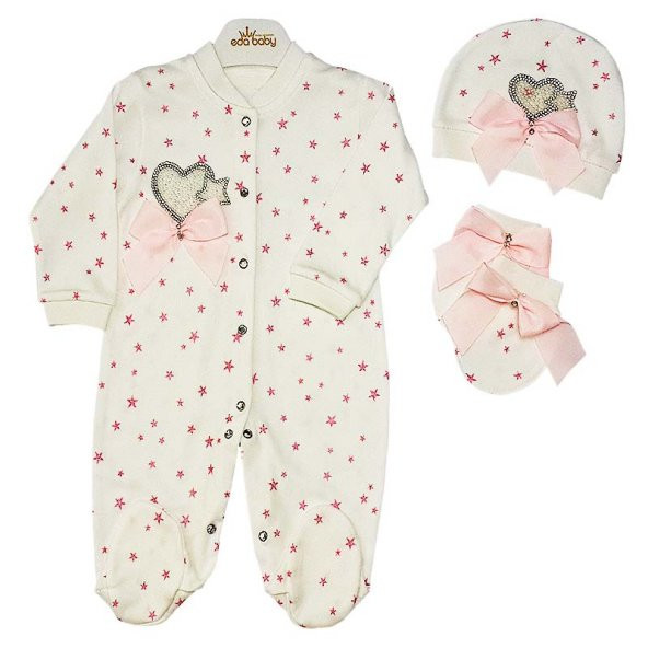 Eda Baby Yıldız Baskılı Tulum Set -Ekru -Pembe Kurdeleli