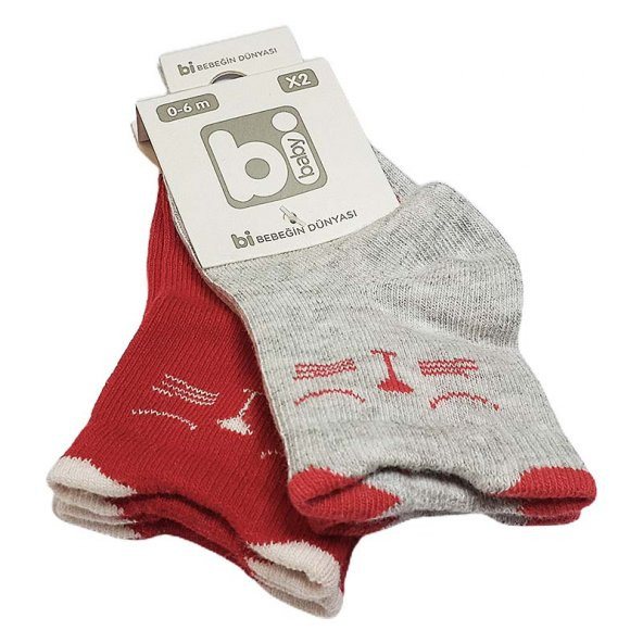 Bibaby Bebek Çorabı 2 li 0-6 Ay -Kedili - Gri - Kırmızı