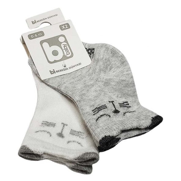 Bibaby Bebek Çorabı 2 li 0-6 Ay -Kedili - Gri - Beyaz