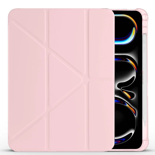 iPad Pro 11 inç M4 2024 Uyumlu Kılıf Üçgen Katlanabilir Kalem Şarj Bölmeli Kılıf A2836 A2837 A3006 Pembe