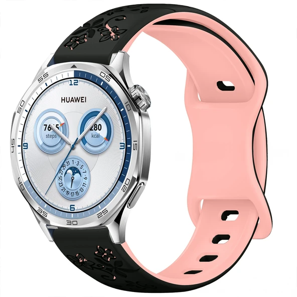 Huawei Watch GT2 GT3 GT4 GT5 46mm İle Uyumlu FloraFlex Çiçek Desenli Silikon Kordon Pembe