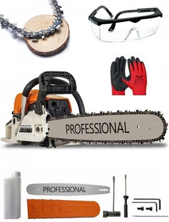 Mager Çift Egzoz Benzinli Testere Bıçkı Ağaç Kesme Motoru 52cc Gözlük Yedek Zincir Eldiven Hediye