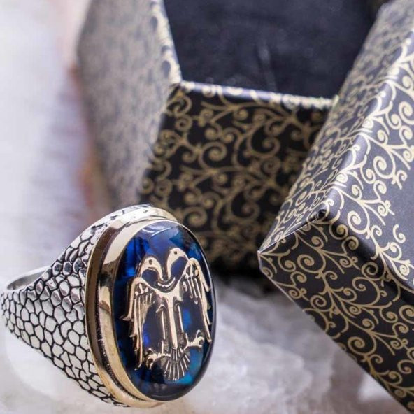 925 Ayar Gümüş Büyük Mavi Mineli Selçuklu Kartalı Erkek Yüzük