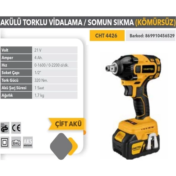 Chattel Profesyonel 21V Akülü Darbeli Somun Sökme 1/2" Kömürsüz Motor CHT4426
