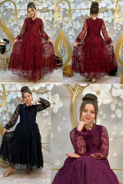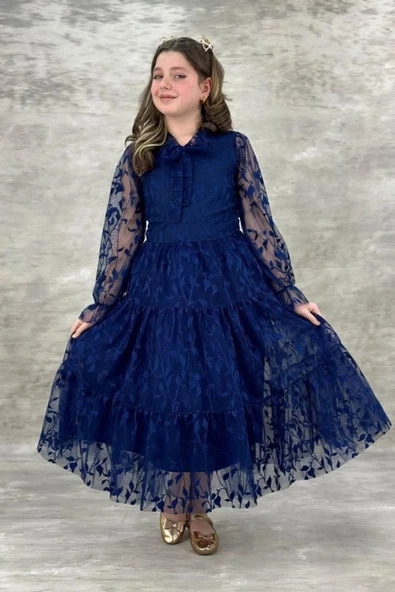 Dantel Yaprak Kız Çocuk Uzun Abiye Elbise 11 - 14 Yaş