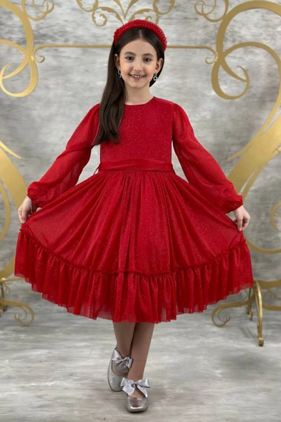 Kırmızı Tül Etekli Simli Çocuk Elbise
