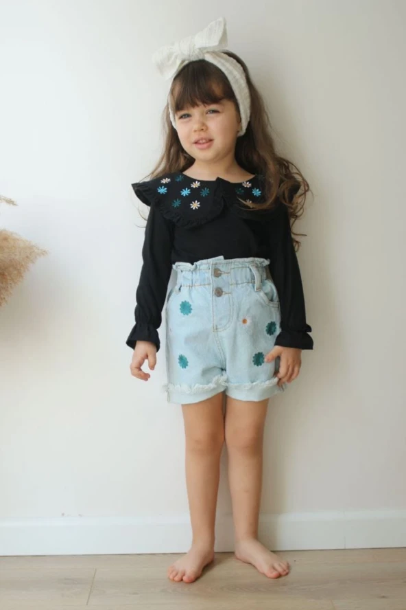 Kız Çocuk Papatya Nakış Kot Şort Bady Tarz Takım
