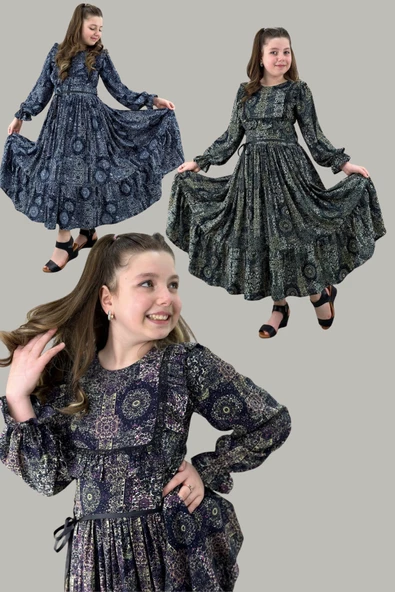 Desenli Tam Boy Uzun Kol Kız Çocuk Elbise