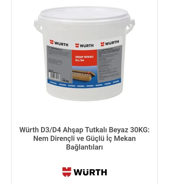 Würth D3/D4 Ahşap Tutkalı Beyaz 30KG: Nem Dirençli ve Güçlü İç Mekan Bağlantıları