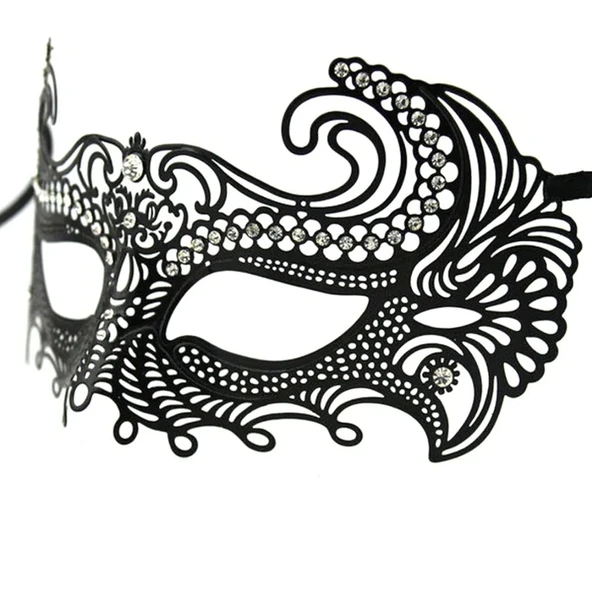 Siyah Lazer Kesim Kristal Taşlı Metal Venedik Maskesi