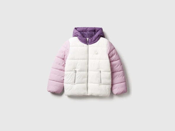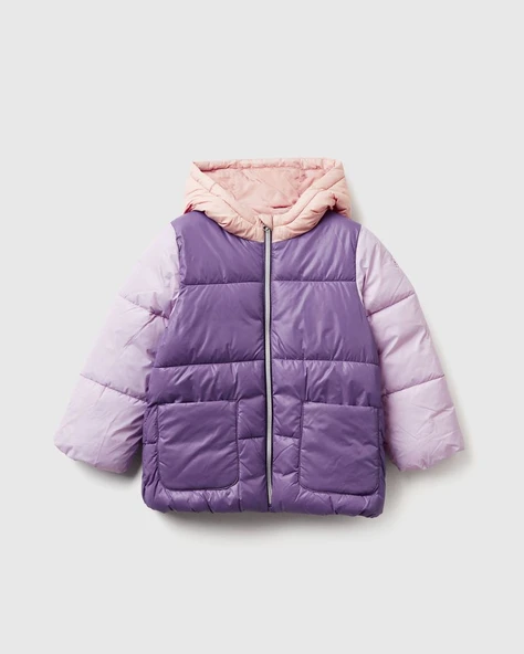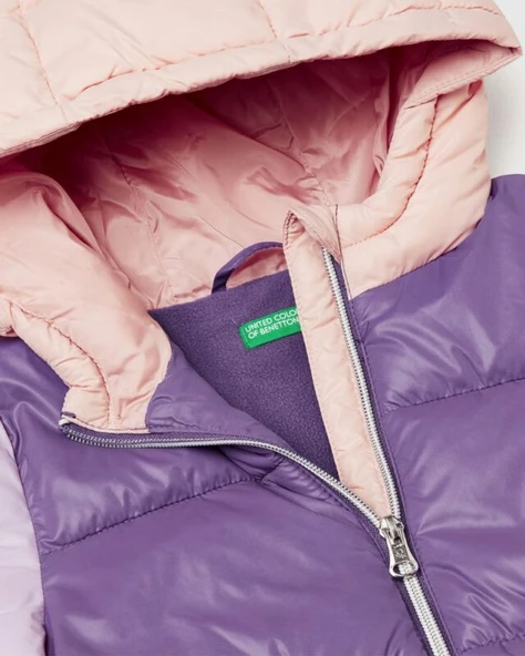 Kız Çocuk Ekru-Lila Sol Göğsü Logo İşlemeli Cepli Kapüşonlu Yüksek Yaka Mont