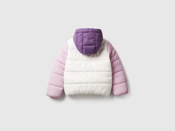 Kız Çocuk Ekru-Lila Simli Logo Detaylı Kapüşonlu Mevsimlik İnce Mont