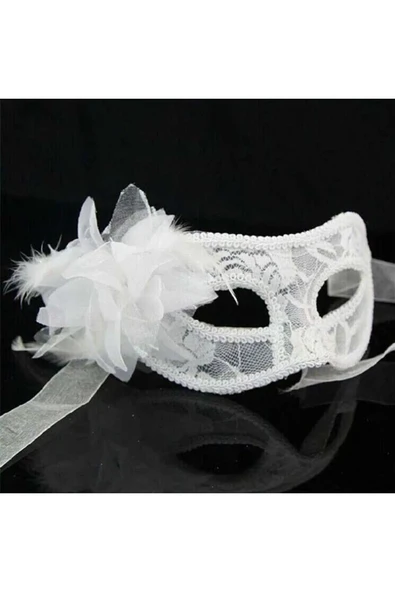 Vipfoni Dantel İşlemeli Beyaz Yandan Tüylü Balo Parti Maskesi 17x20 cm