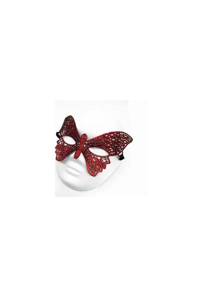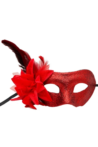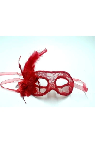 Vipfoni Dantel İşlemeli Kırmızı Yandan Tüylü Balo Parti Maskesi 17x20 cm