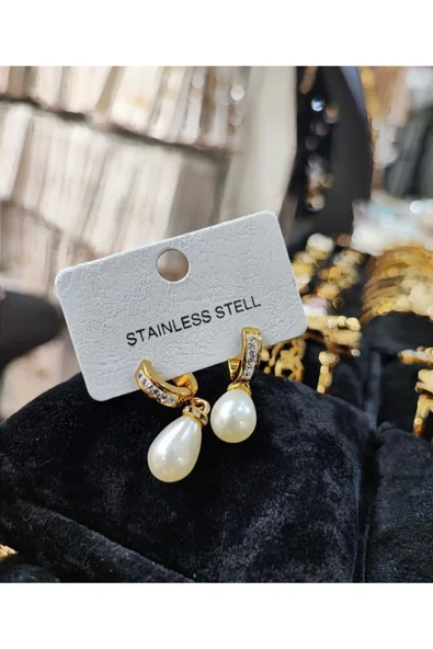 Vipfoni Zirkon Taşlı Damla İncili Çelik Küpe