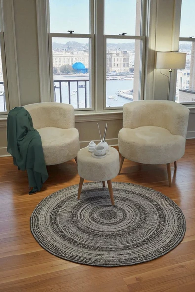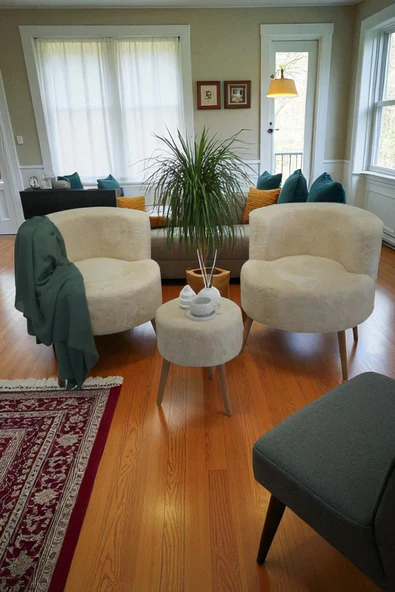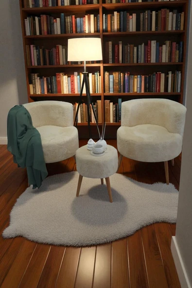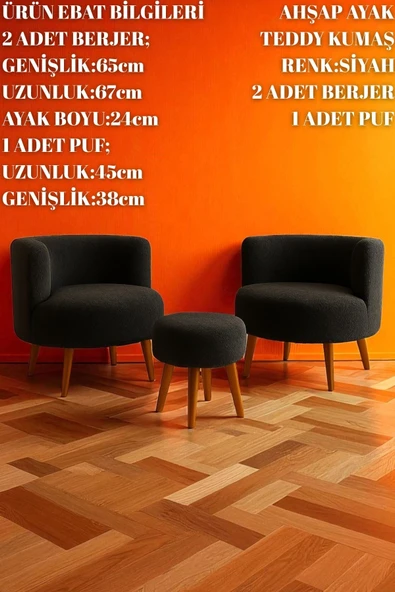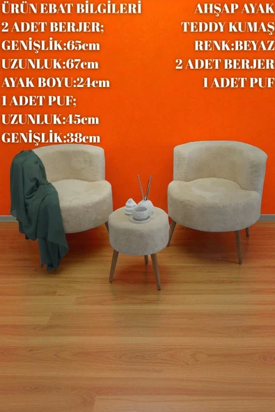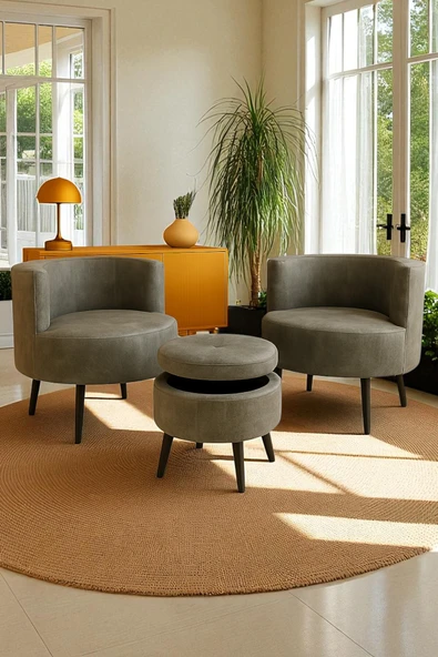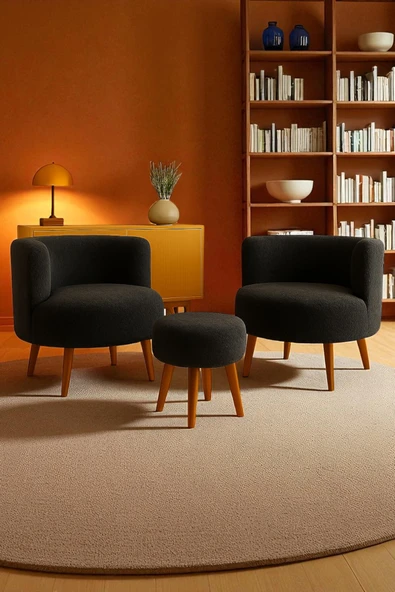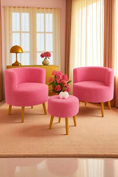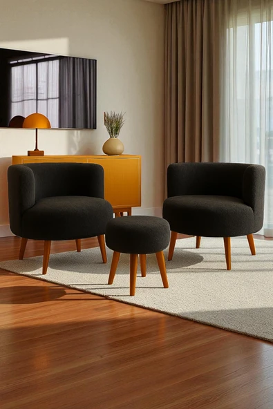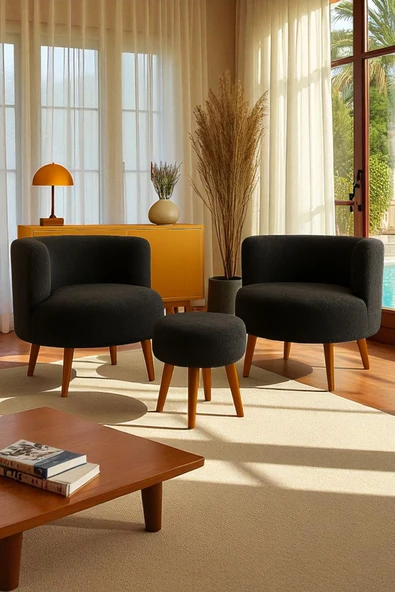 WoodyMaison Janna – Üçlü Set, İki Berjer ve Bir Puf,(Salon, Balkon, Ofis) Konforlu Oturma Takımı