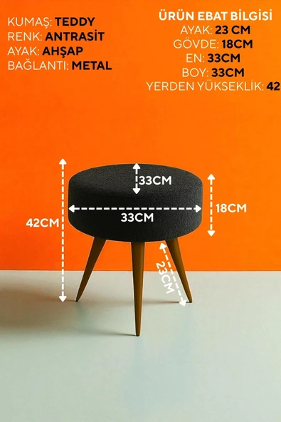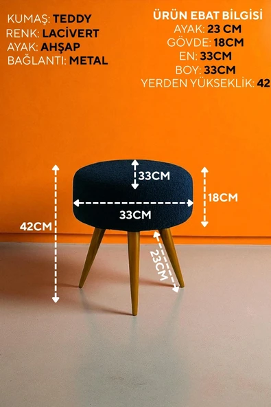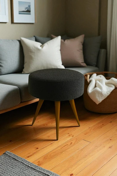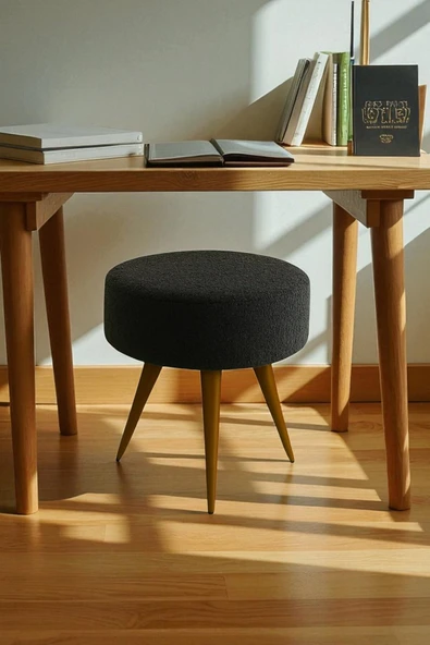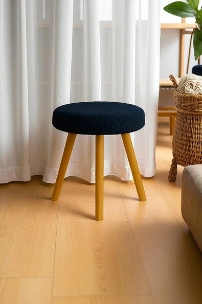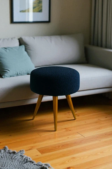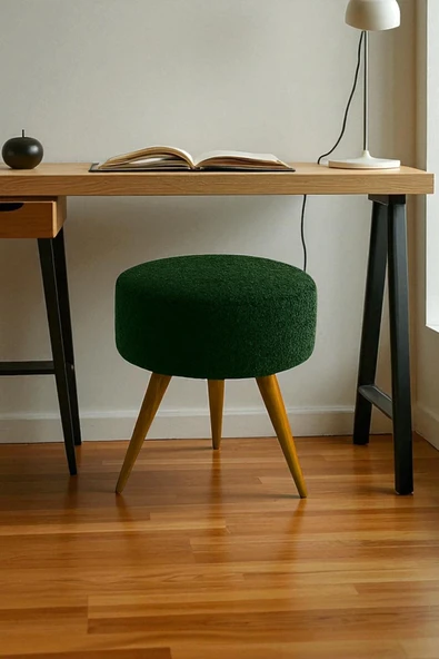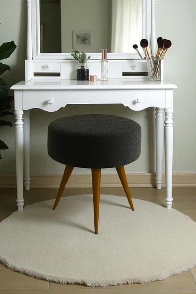 WoodyMaison Verona Dekoratif Peluş Puf Tabure – Yuvarlak Ahşap Ayaklı Retro Bench, Makyaj Masası & Salon Pufu