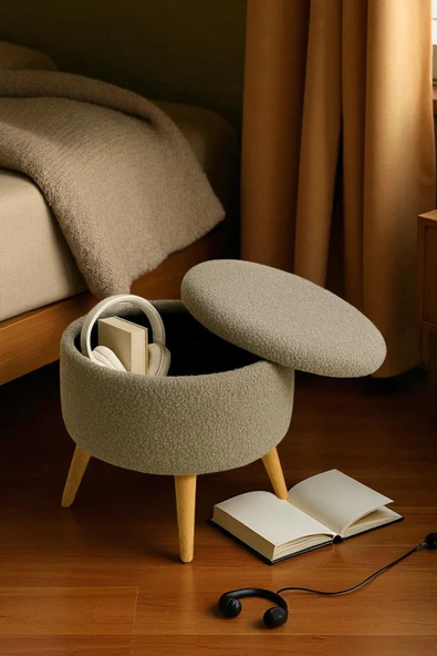 WoodyMaison Nova Sandıklı Puf – Teddy Peluş Yuvarlak, Ahşap Ayaklı Retro Dekoratif Bench