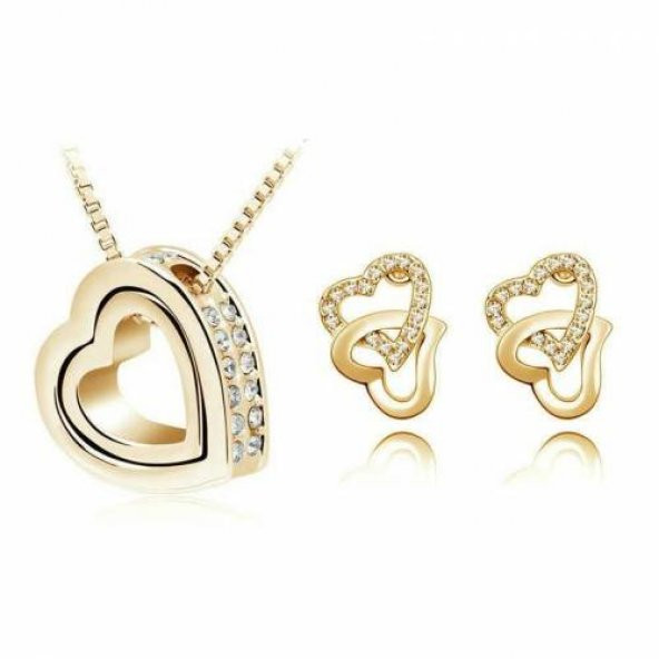 Worldshop ÇİFT KALP MODEL TAKI SETİ KOLYE KÜPE 18 GP ALTIN KPLM. AHŞAP KUTU İÇERİSİNDE