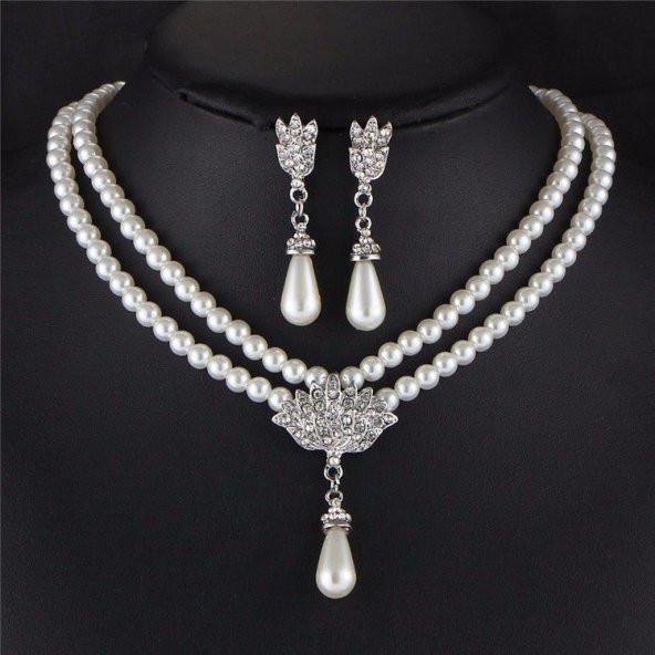 Worldshop PIRLANTA İŞLEMELİ KOLYE KÜPE KALP İNCİ TAKI SETİ