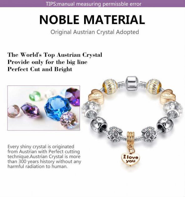 Worldshop Pandora Tarz, Yeni Trend, Renk Seçenekli Kristal Taşlı Charm Bileklik, Ahşap Kutu Içerisinde