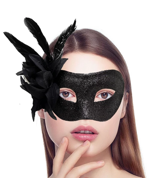 Siyah Renk Metalize Sim Görünümlü Parlak Tüylü Parti Maskesi 22x19 cm