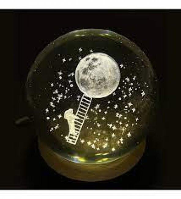 Dekoratif Merdiven Astronot Tasarımlı Ahşap altlıklı Işıklı Cam Küre Büyük Boy Cam:8cm Ahşap:2cm