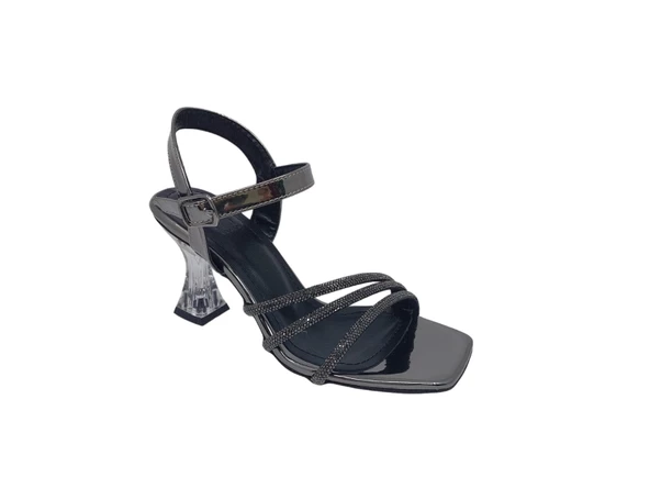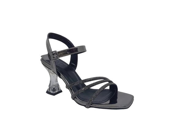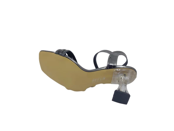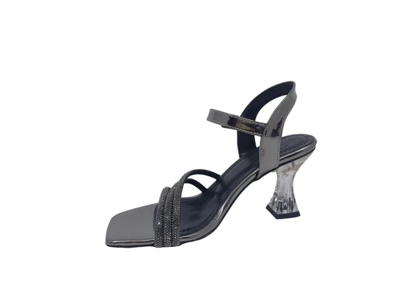 Zerhan 120 Kadın Gri Burnu Kapalı Arkası Açık Sivri Burun Taşlı Şeffaf Topuklu Ayakkabı