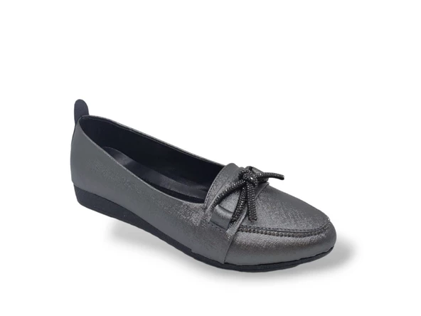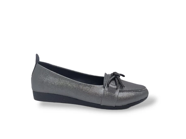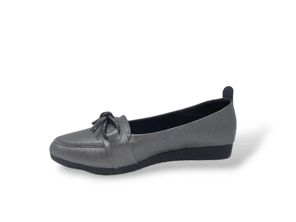 Zerhan 3042 Kadın Platin Taşlı Fiyonklu Pırıltılı Babet Ayakkabı
