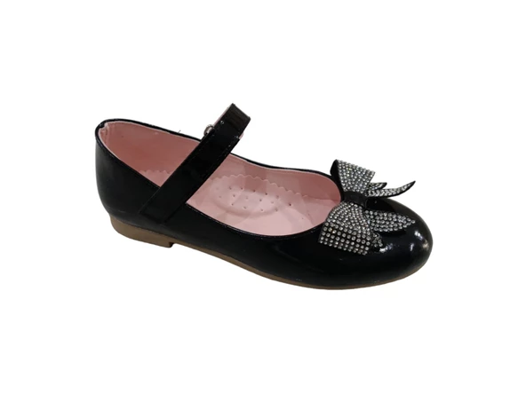 Zerhan 155 Kız Çocuk Siyah Rugan Fiyonklu Taşlı Cırtlı Babet Ayakkabı