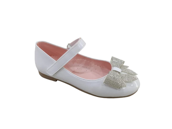 Zerhan 155 Kız Çocuk Beyaz Rugan Fiyonklu Taşlı Cırtlı Babet Ayakkabı