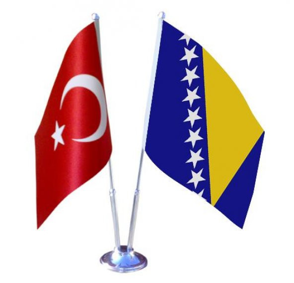 Masa Üstü Bosna Bayrağı Türk Bayrağı İkili Krom Direk ile Birlikte